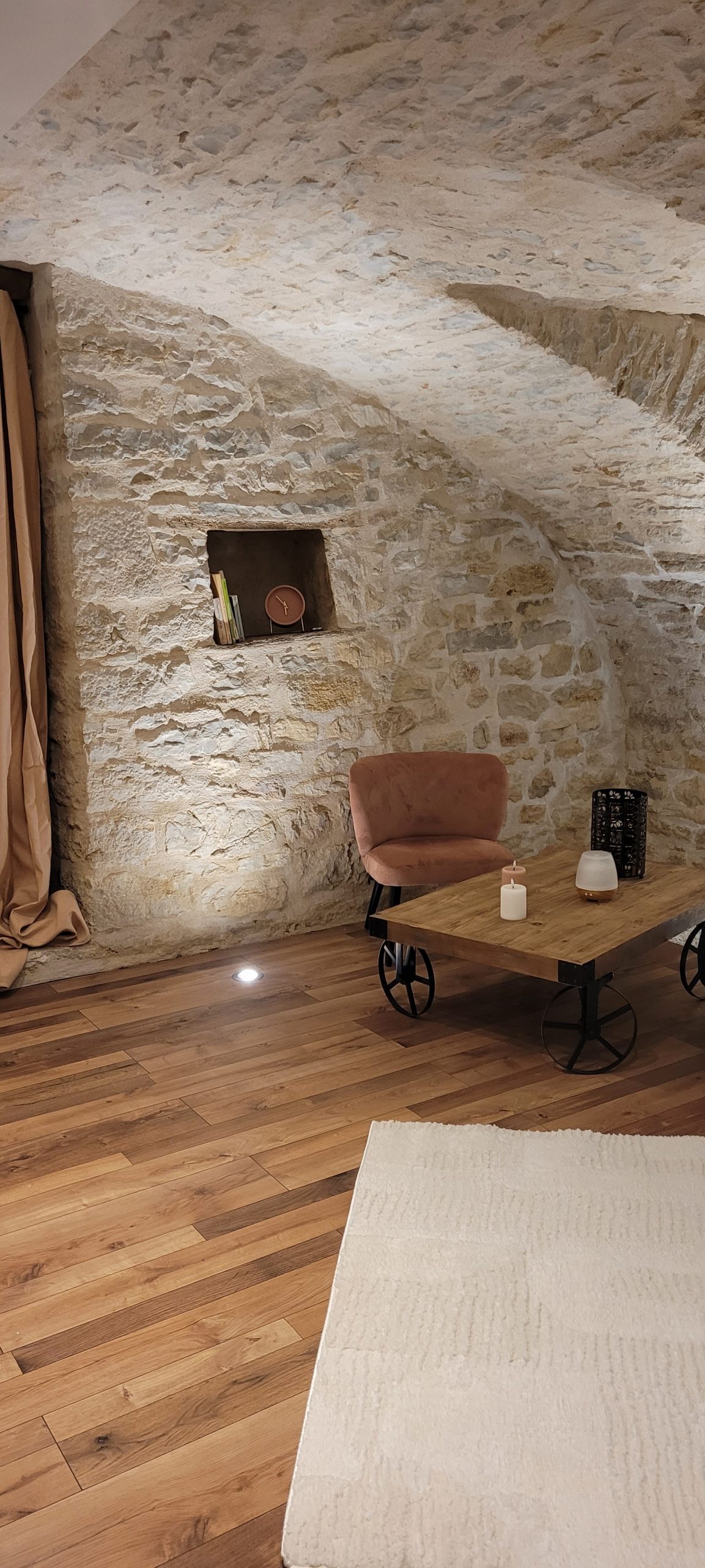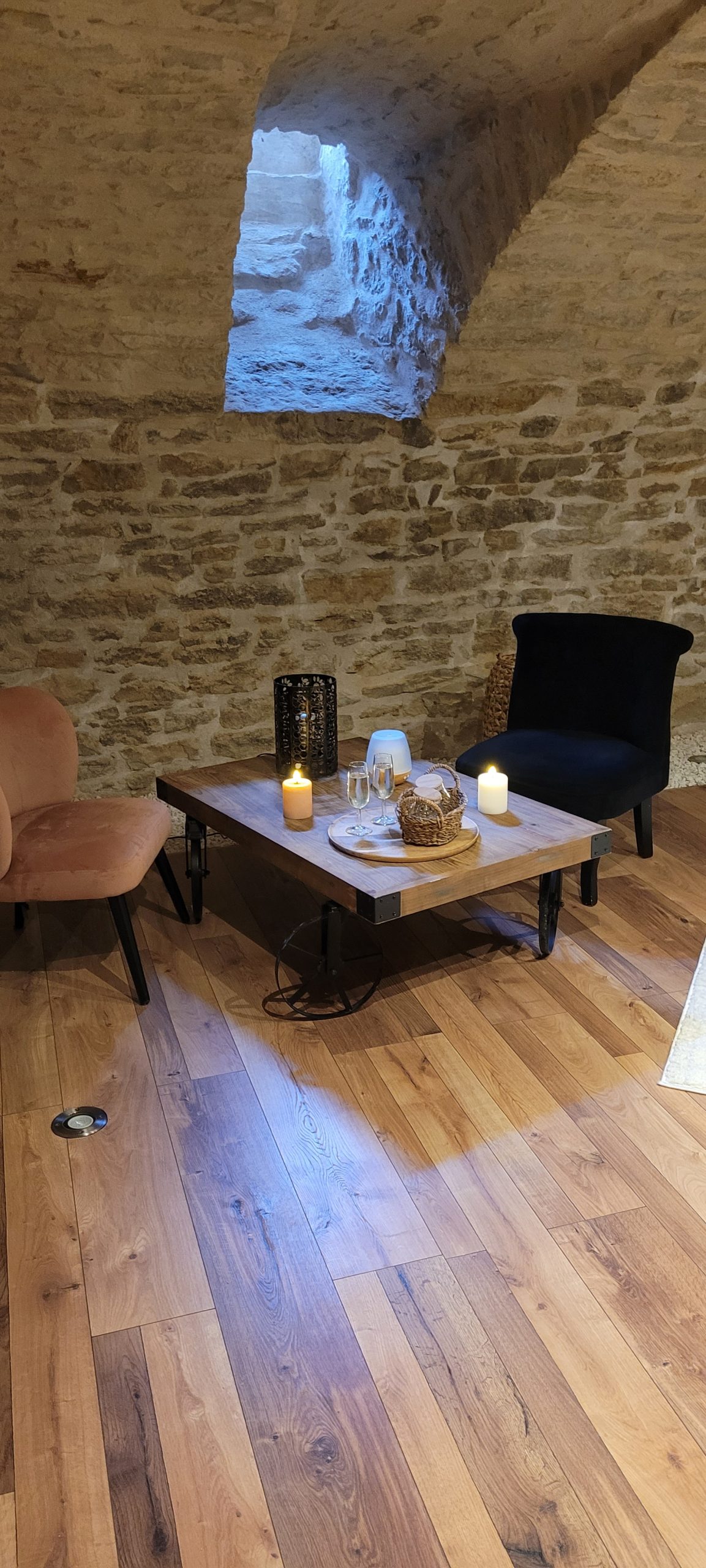 La pierre, la voûte, la lumière douce et le silence créent une atmosphère hors du temps. Naturellement fraîche en été et enveloppante en hiver, la cave devient un cocon propice au ralentissement, loin du bruit et des sollicitations du quotidien.