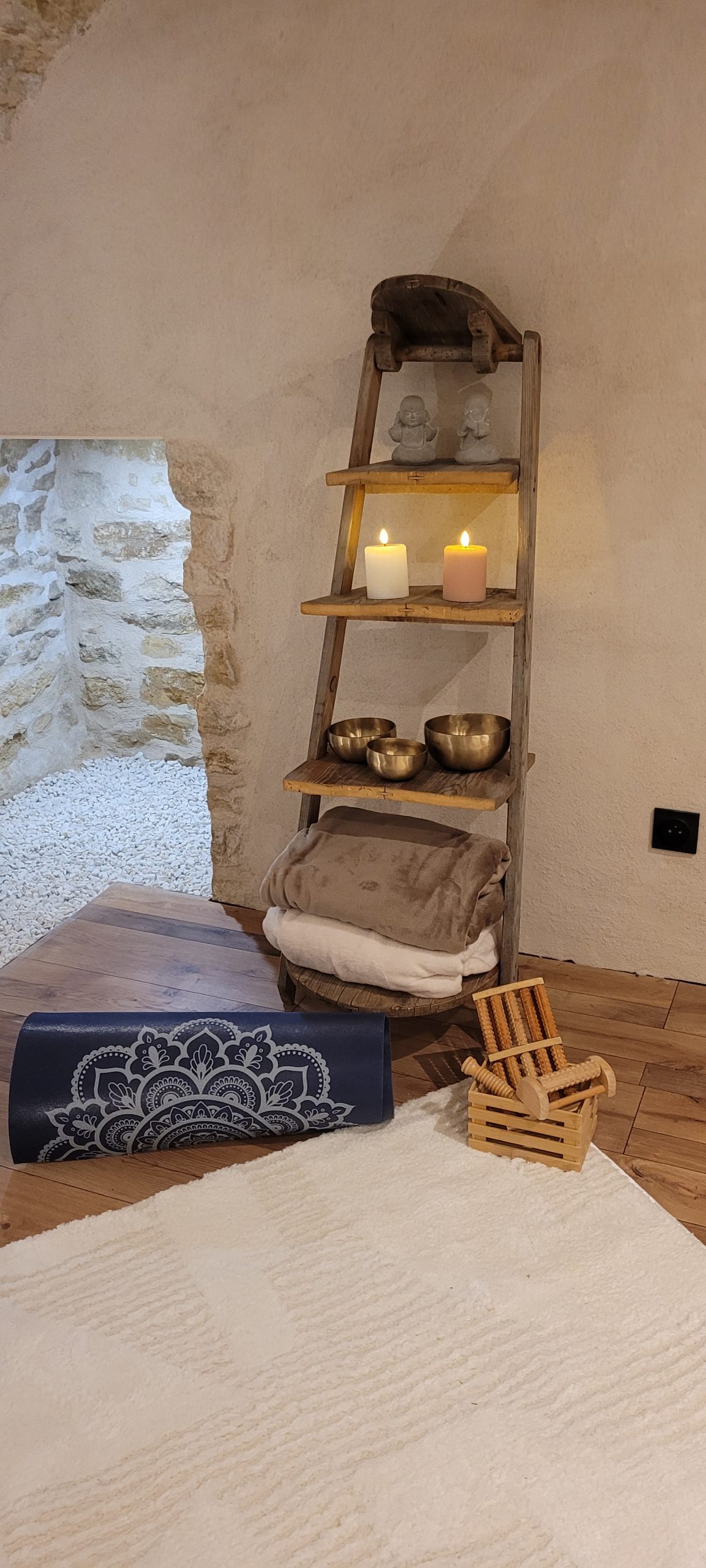 Des accessoires de détente (rouleaux de massage pour les pieds et le dos) sont également à disposition pour prolonger ces moments en toute autonomie.